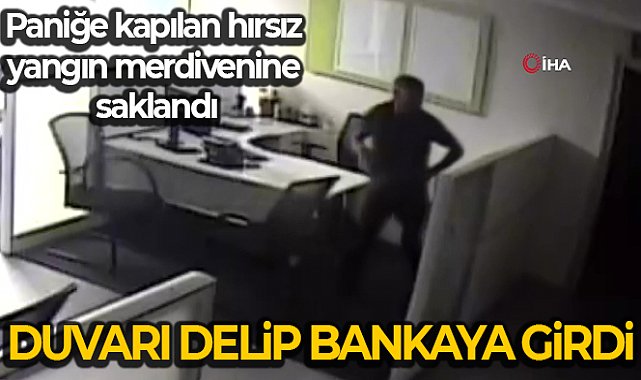 Olay gece Esenyurt Doğan Araslı Bulvarı'nda yaşandı. Caddede bulunan bir iş hanına giren hırsız, ikinci katta bulunan bir iş yerinden laptop, tablet ve bin 40 TL para çaldı. Zanlı daha sonra duvarı delerek yan taraftaki banka şubesine geçti. Bu sırada alarmın çalmasıyla paniğe kapılan zanlı, yangın merdivenine saklandı.